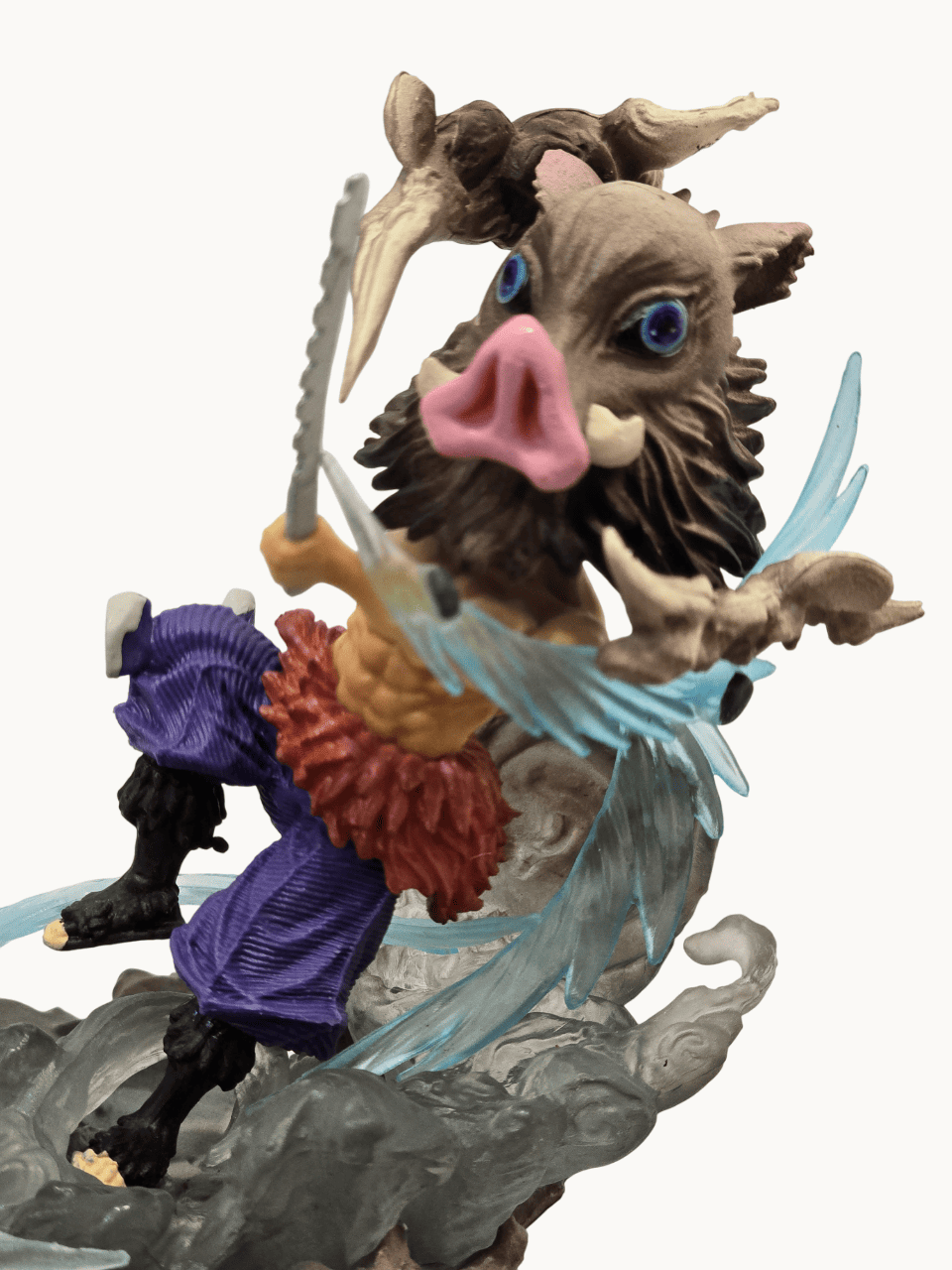 Untamed, unstoppable, and bursting with raw instinct, the Boar Mask Warrior charges forward with fearless energy. His dual blades slice through the air as swirling blue slashes erupt around him, capturing the wild rhythm of a fighter who trusts only his senses. The fierce expression beneath the iconic boar mask and the explosive stance reflect the spirit of a warrior who follows no rules — only pure battle instinct. This figure brings chaos, strength, and wild charisma together in one striking motion sculpture.